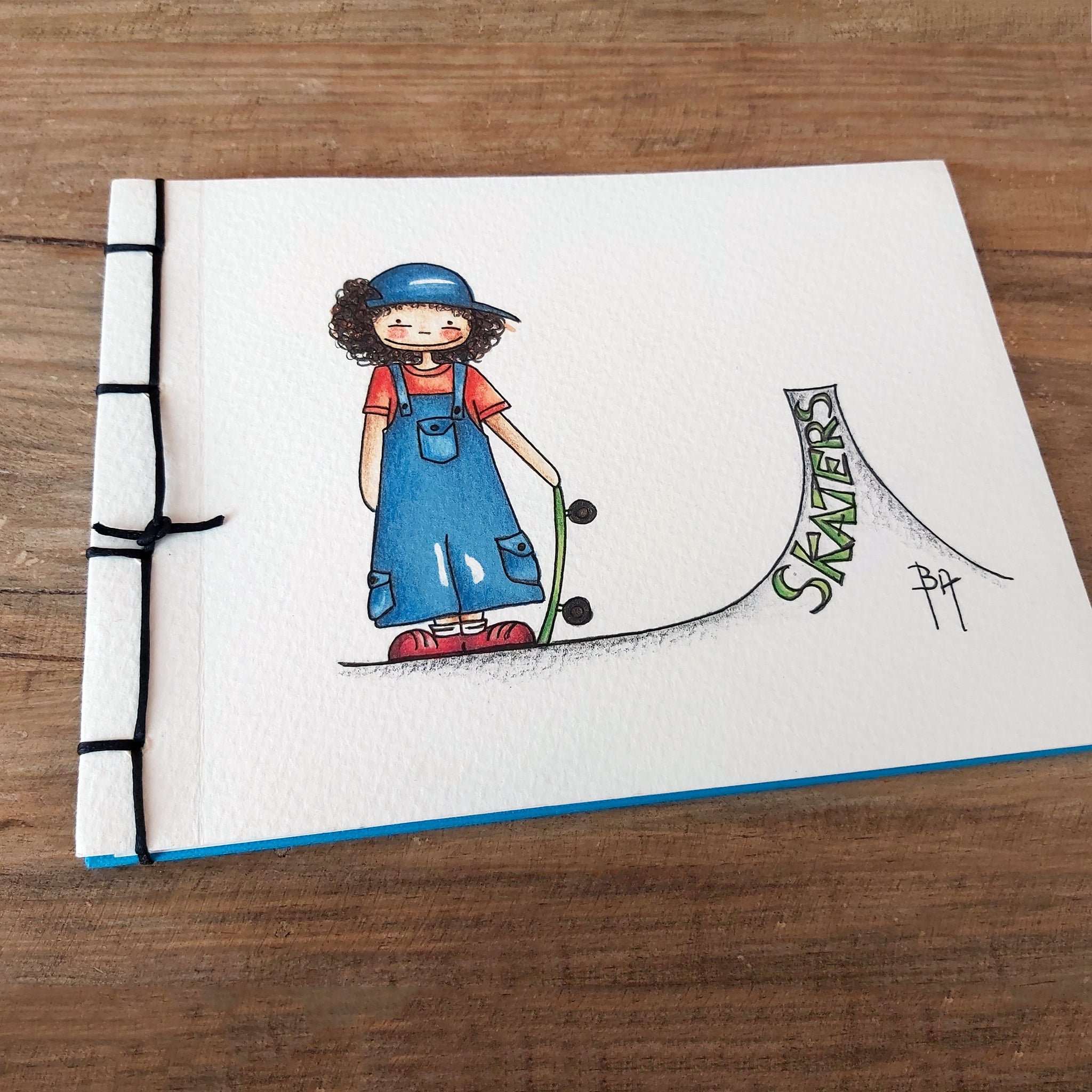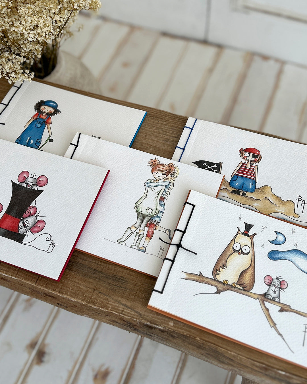 Album ilustrado a mano en papel de acuarela. 8 hojas interiores para incluir hasta 16 fotografías 10x15cm. Encuadernación japonesa.